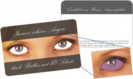 Demonstrieren Sie mit der UV-CARD den UV-Schutz von Sonnenbrillengläsern. Halten Sie die Karte, die mit 86 x 54 mm Scheckkartengröße besitzt, einfach in die Sonne oder unter eine UV Lampe. Decken Sie ein Auge mit dem Brillenglas ab und vergleichen Sie die Verfärbung der Augen.Ihre Kunden freuen sich über dieses kleine “Give-away”, da es einerseits die Hochwertigkeit Ihrer neuen Brille zeigt und andererseits genutzt werden kann, um UV-Strahlung (z.B. am Strand beim Sonnenbad) sichtbar zu machen.